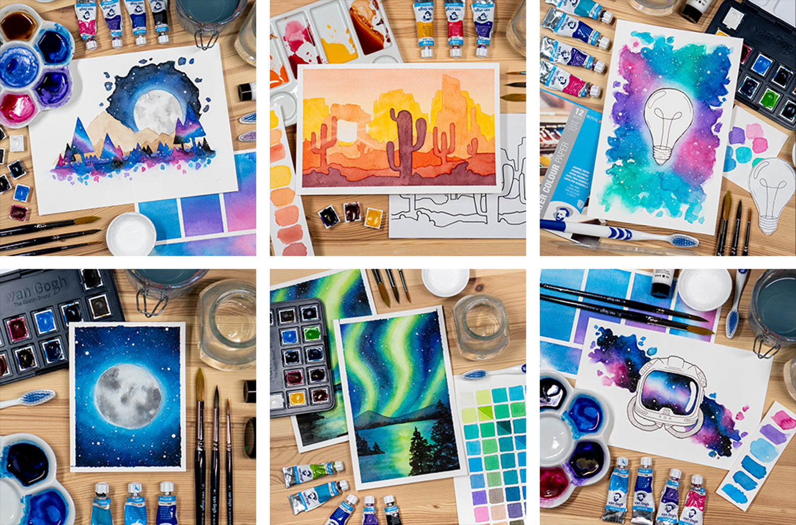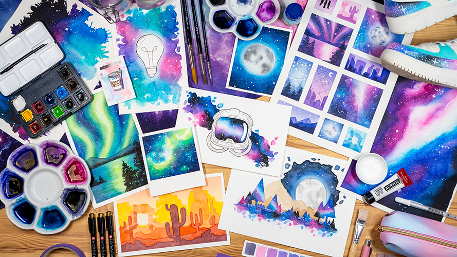 Aan het einde van deze cursus heb je niet alleen 6 indrukwekkende illustraties gemaakt, maar voel je je ook zelfverzekerder in je waterverftechnieken. Bovendien eindig je met unieke 6 kunstwerken in Galaxy thema!